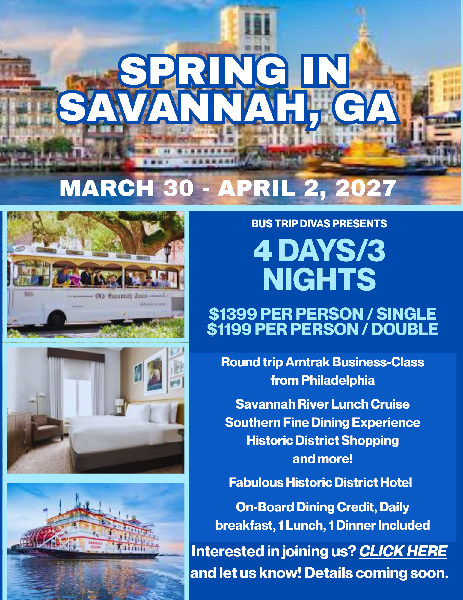 Spring in Savannah, GA 2027 Are you ready to join the Divas for a sensational Spring Daycation in Savannah, Georgia? Complete the form to add your name to the list!